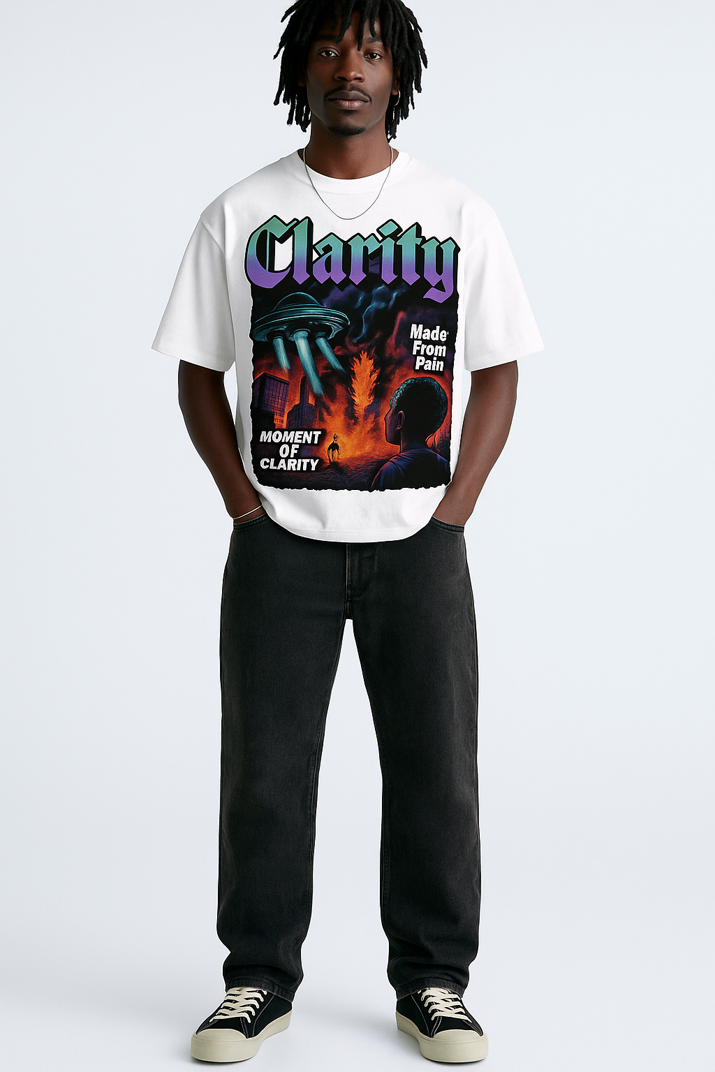 Step into your Moment of Clarity. This bold graphic tee blends cosmic chaos with emotional depth—UFOs, fire, and shadows of pain. It’s not just a shirt, it’s a statement: “Made from Pain.” For those who’ve been through it and came out clearer, stronger, and unstoppable.